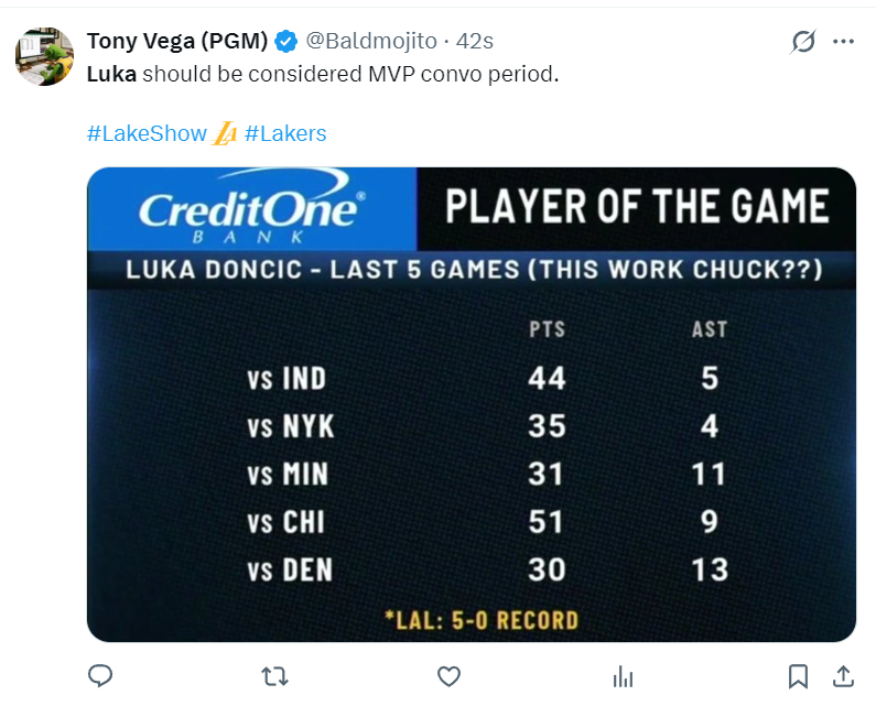 湖人媒体晒出东契奇最近几场比赛的数据力挺他应该进入MVP讨论。